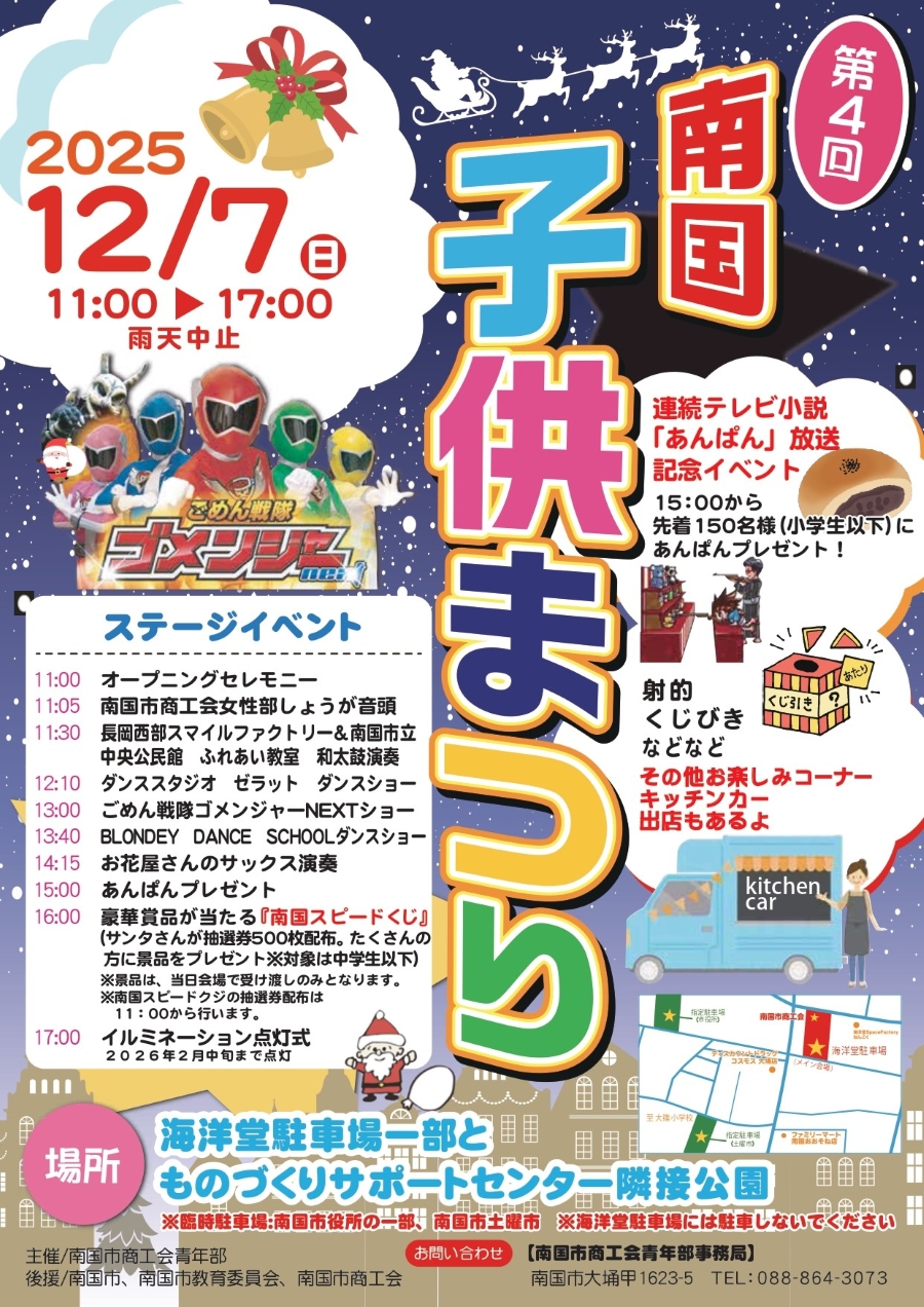 南国市大埇甲の海洋堂 Space Factory なんこくの駐車場などで 12 月 7 日(日)、「第 4 回南国子供まつり」が開催されます。