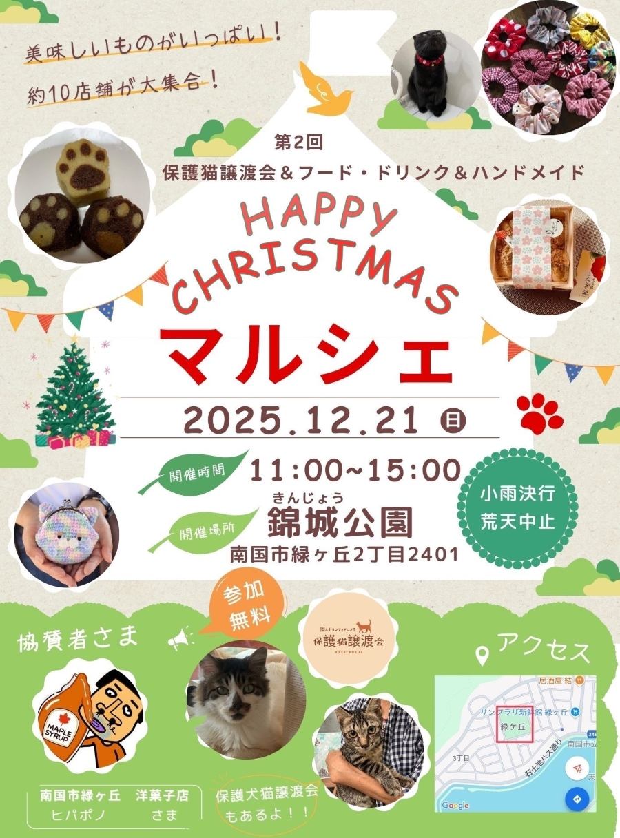 南国市緑ケ丘 2 丁目の錦城公園で 12 月 21 日(日)、「HAPPY CHRISTMAS(ハッピークリスマス)マルシェ」が開かれます。
