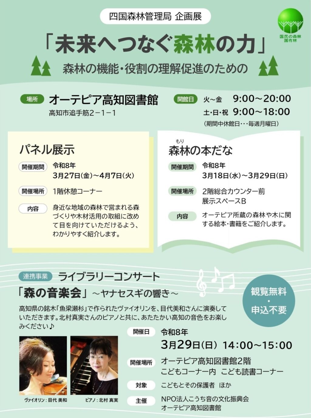 - 春のライブラリーコンサート「森の音楽会」~ ヤナセスギの響き ~… 29 日(日)14:00~15:00。魚梁瀬杉で作られたバイオリンとピアノの演奏が披露されます。詳しくはこちら