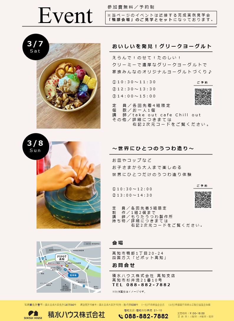 積水ハウスの実例見学会「住まいの参観日」で 3 月 7 日(土)、8 日(日)、親子向けワークショップが開かれます。会場は、高知市鴨部 1 丁目の四国ガスショールーム「ピポット高知」です。