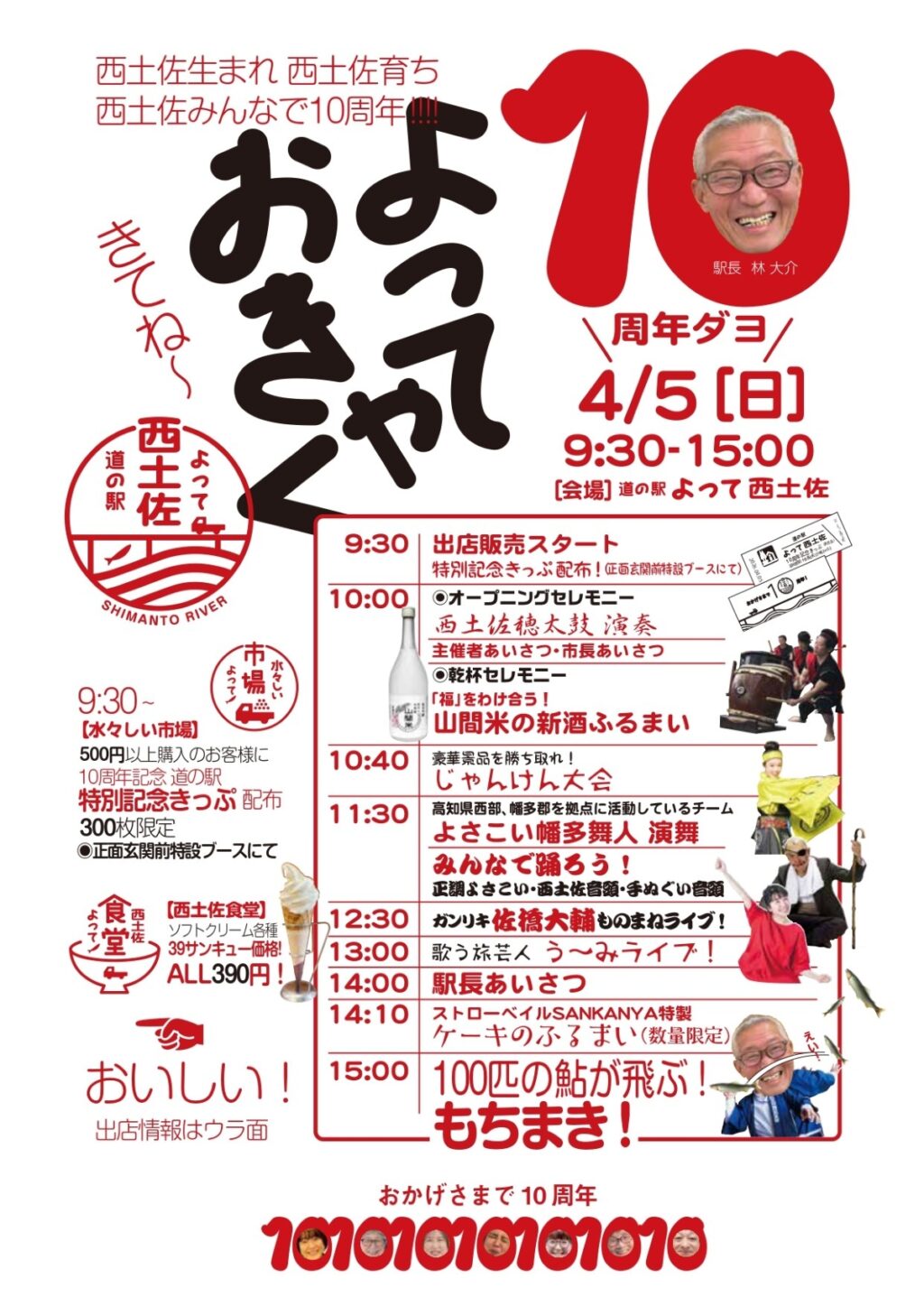 四万十市西土佐江川崎の道の駅「よって西土佐」で 4 月 5 日(日)、開業 10 周年記念イベント「10 周年だよ!よっておきゃく!」が開かれます。