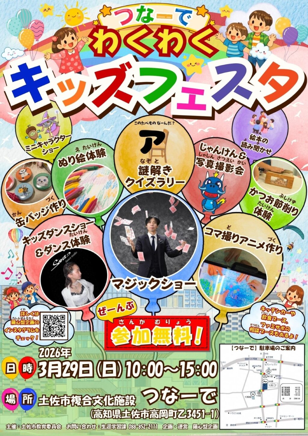 土佐市高岡町乙の市複合文化施設「つなーで」で 3 月 29 日(日)、「つなーでわくわくキッズフェスタ」が開かれます。