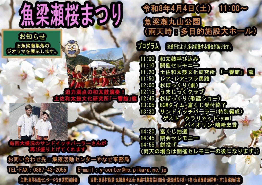 富くじや餅投げのほか、和太鼓の演奏、地域の団体による劇やマジック、フラダンスショーなどが披露されます。旧魚梁瀬集落のジオラマもお披露目されます。