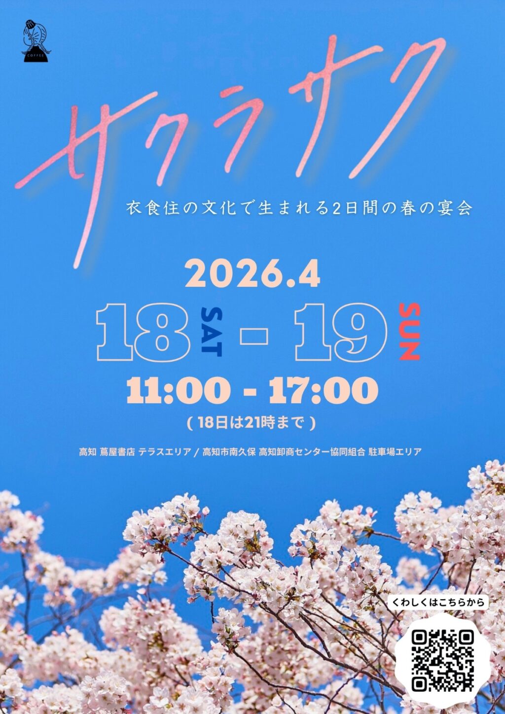高知市南御座の高知蔦屋書店テラスエリアと、高知市南久保の高知卸商センター協同組合の駐車場エリアで 4 月 18 日(土)、19 日(日)、「サクラサク」が開かれます。