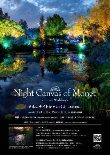 - 見どころ:モネの庭をイメージした花火が打ち上げられます。「モネのナイトキャンバス」の期間中はキャンドルやライトアップで幻想的な光景が楽しめ、謎解きゲームなども開催されます。