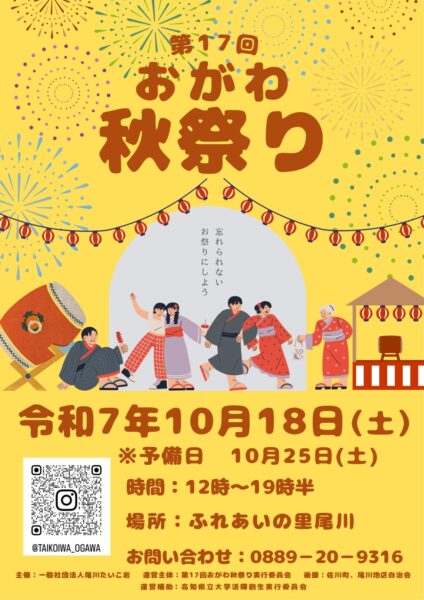 「第 17 回おがわ秋祭り」が 10 月 18 日(土)、佐川町本郷の「ふれあいの里尾川」で開かれます。19:00 から花火が打ち上げられます。
