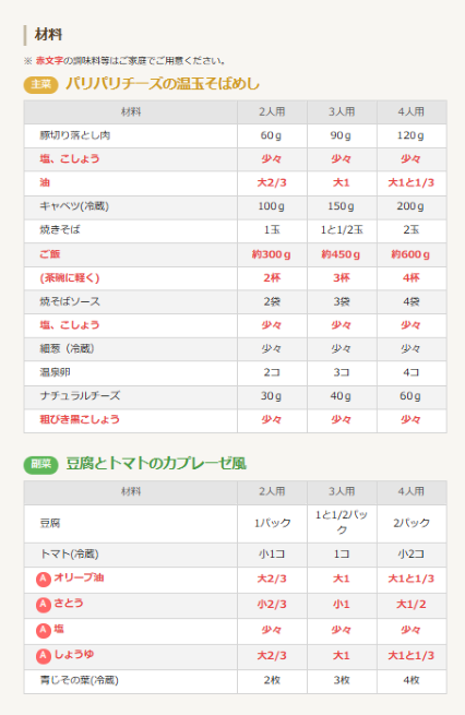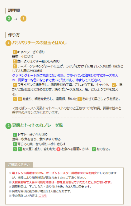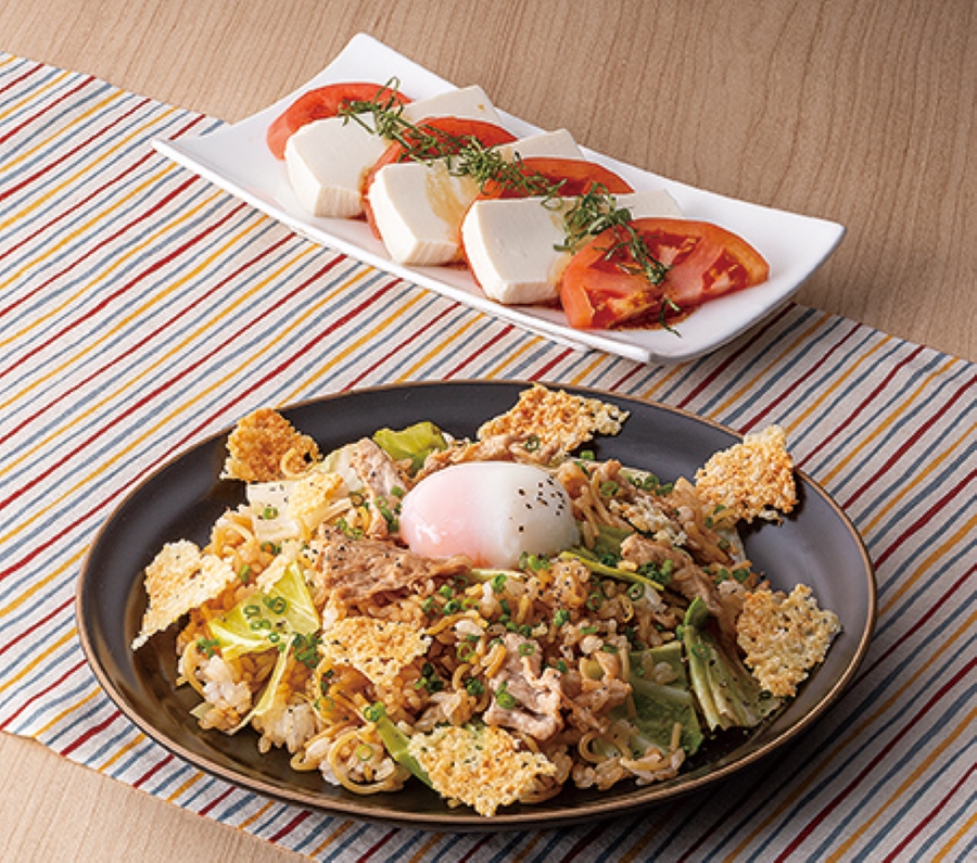 - 土曜日:主菜「パリパリチーズの温玉そばめし」、副菜「豆腐とトマトのカプレーゼ風」