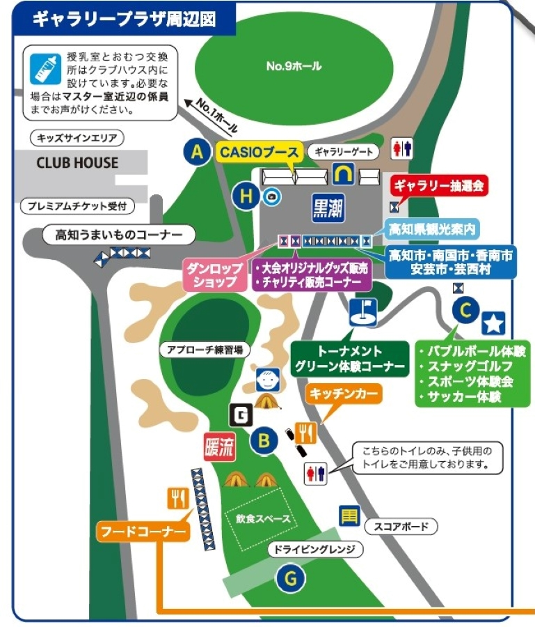 - 時間:ゴルフのスタート時間は開催日によって異なります。グッズ販売は 8:00 から、CASIOショップやこども広場は 9:00 から
