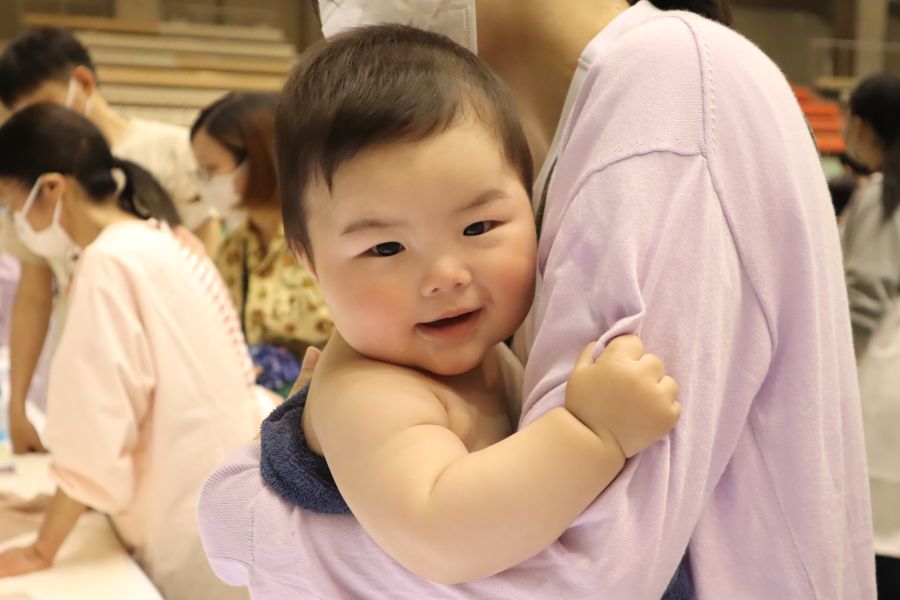 会場内では今年も、昨年に続いて「泣き笑い相撲」が行われました。赤ちゃん 2 人が向かい合い、20 秒以内に元気な笑い声、泣き声を出した方が勝ちというイベントです。