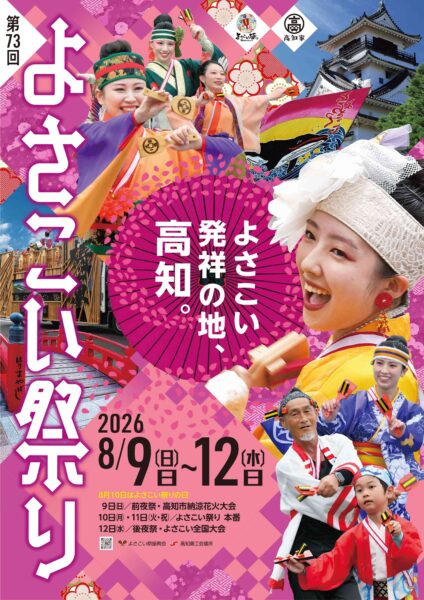 第 73 回よさこい祭りは 8 月 9 日(日)が前夜祭、10 日(月)、11 日(火・祝)が本番、12 日(水)が後夜祭と全国大会です。