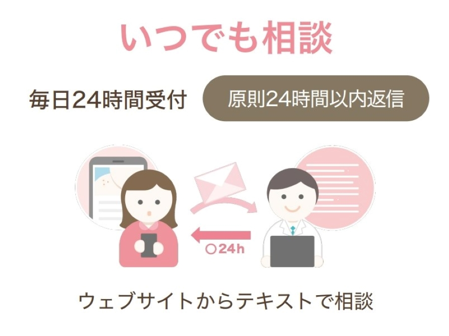「いつでも相談」は「小児科オンライン」のウェブサイトから、テキストで質問します。24 時間 365 日相談でき、原則 24 時間以内に小児科医から回答が届きます。