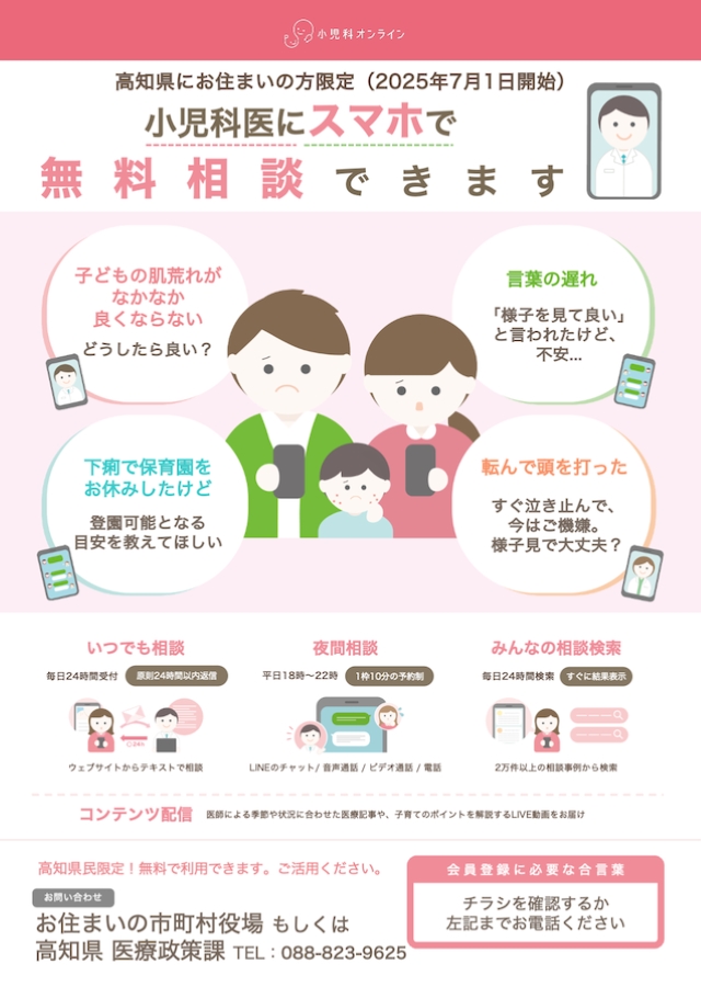 そんな高知のママパパに活用してもらおうと、高知県がオンライン健康医療相談「小児科オンライン」を導入しています。