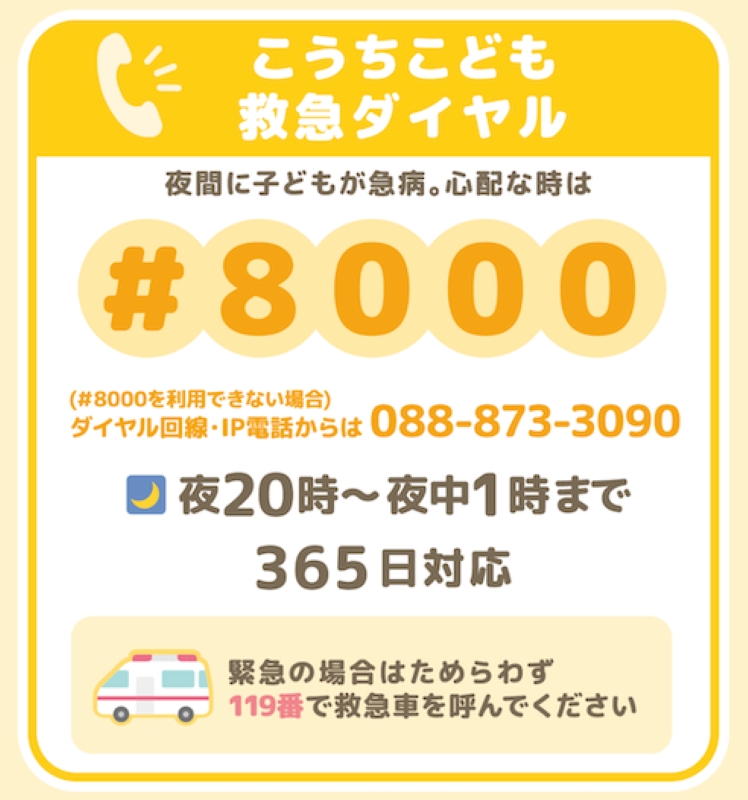 夜間は、こうちこども救急ダイヤル「#8000」を利用すると、相談員の看護師が受診が必要かどうか助言してくれます。