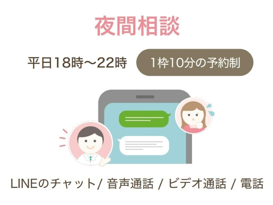 「いつでも相談」は24時間365日相談可能、「夜間相談」は平日18:00〜22:00にリアルタイムで相談