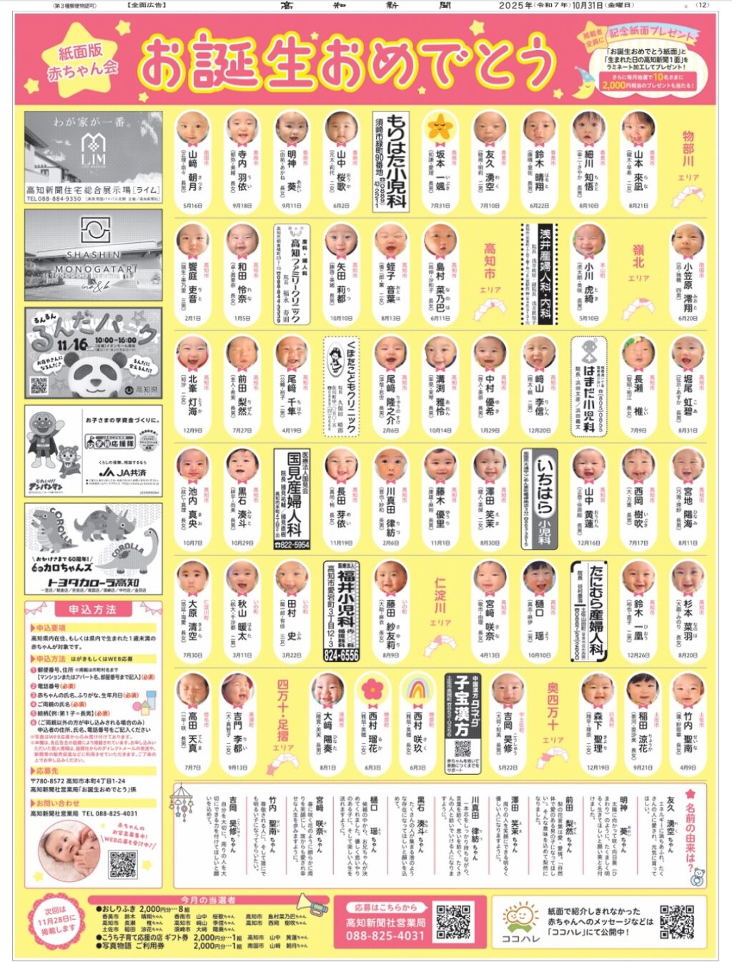 2025 年 10 月の「お誕生おめでとう」は 10 月 31 日(金)の高知新聞 12 面に掲載しています。