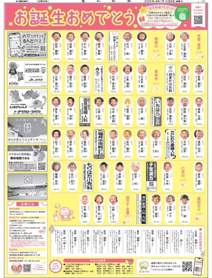 2025 年 12 月の「お誕生おめでとう」は 12 月 26 日(金)の高知新聞 12 面に掲載しています。