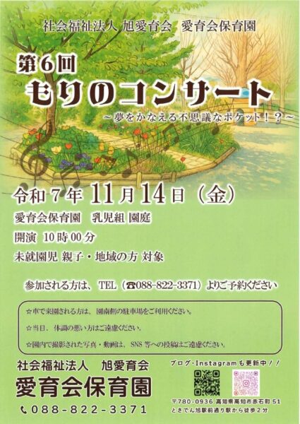 【2025年11月】高知市、室戸市、香美市の多機能型保育「らいーな」のイベントを紹介|園庭開放、サロンなど盛りだくさん!11/13(木)は上街保育園で「赤ちゃんと楽しむ絵本」、11/14(金)は愛育会保育園で「森のコンサート」〈PR〉