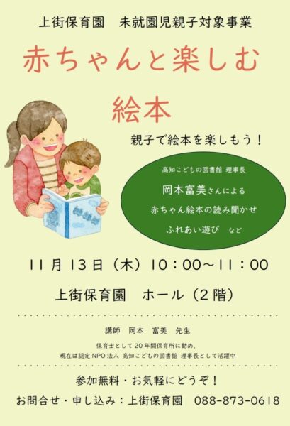 13 日(木)は上街保育園で「赤ちゃんと楽しむ絵本」、14 日(金)は愛育会保育園で「森のコンサート」が開かれます。