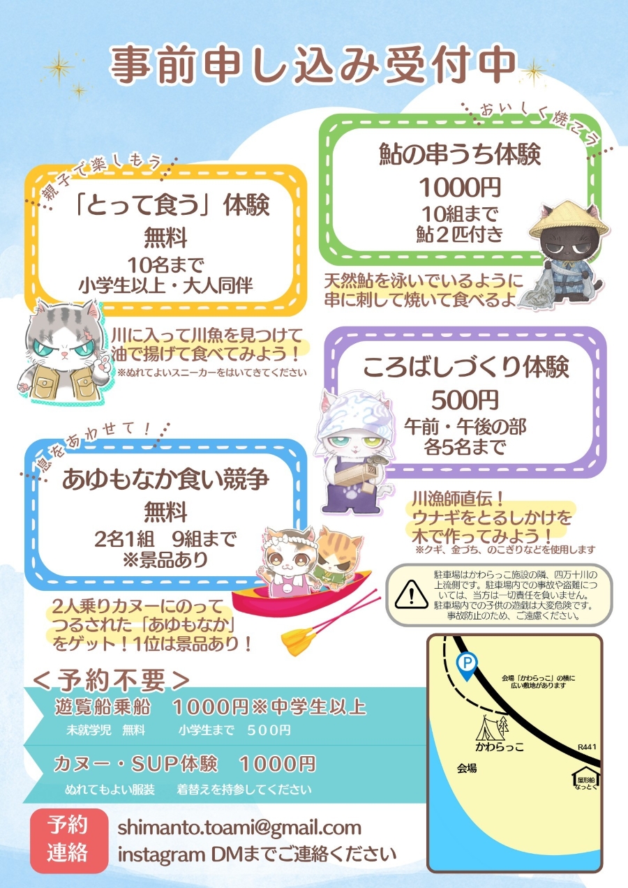 【2025年】四万十市で「第2回鮎感謝祭」(かわらっこ前の河原)|四万十川で遊覧船乗船、カヌーやSUP体験、ミニジップラインや投網体験、ハゼすくい…宝探し、お菓子投げも