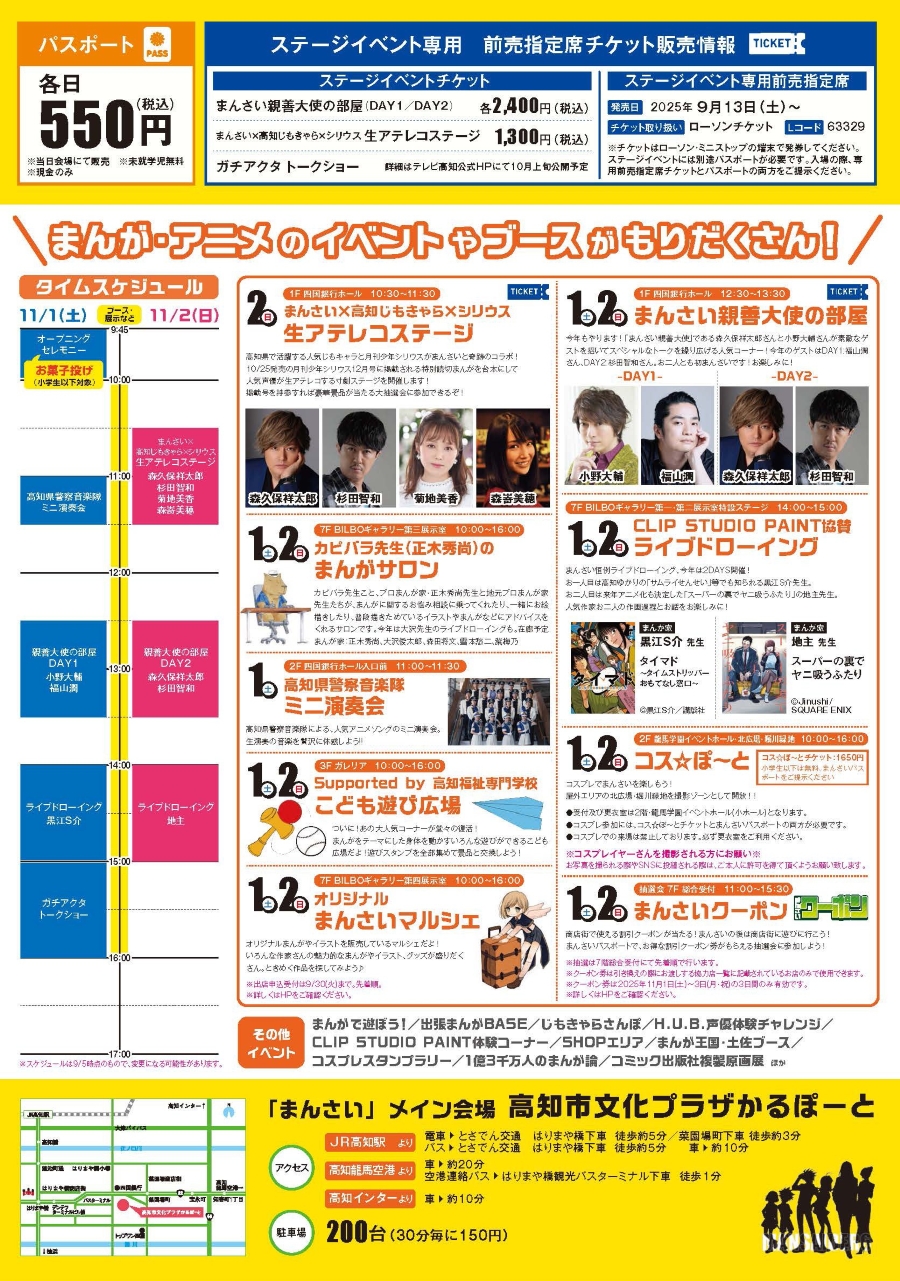 声優の小野大輔さん、森久保祥太郎さんがパーソナリティを担当する「まんさい親善大使の部屋」、漫画家によるライブドローイング、声優や高知のご当地キャラクターの生アテレコステージ、ガチアクタートークショー、まんさいマルシェなどが楽しめます。