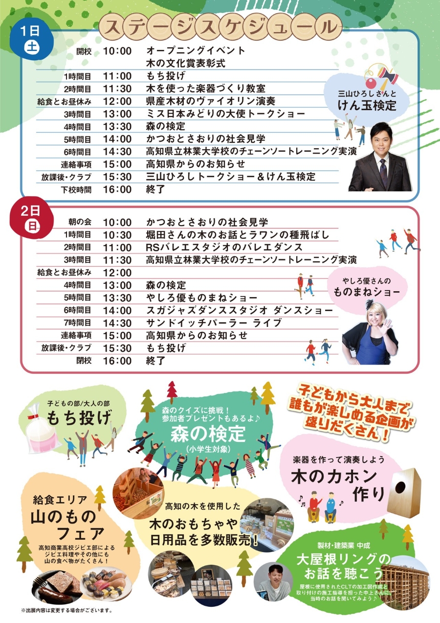 小学生が対象の森の検定は 1 日(土)13:30、2 日(日)13:00からで、クイズに挑戦します。ステージで参加の募集を呼びかけ、両日先着 10 人程度が参加できます。参加者には認定証と参加賞のプレゼントがあります。