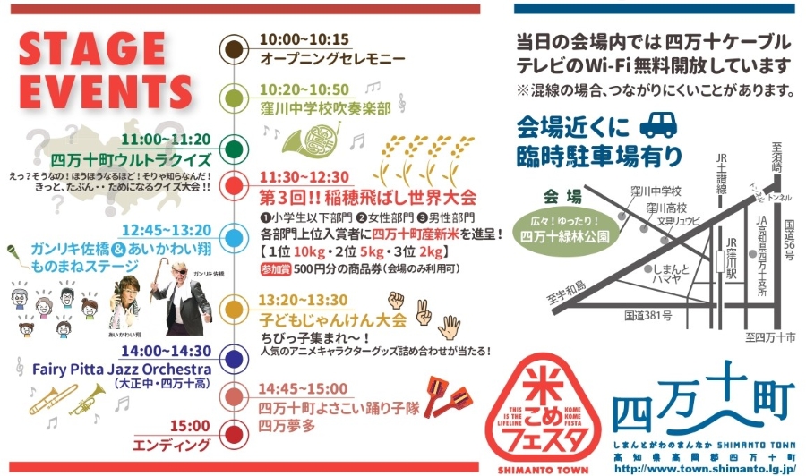 ステージでは、四万十町ウルトラクイズ、稲穂飛ばし世界大会、子どもじゃんけん大会、ガンリキ佐橋さんとあいかわい翔さんによるものまねライブなどがあります。