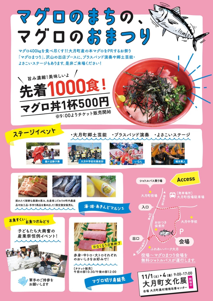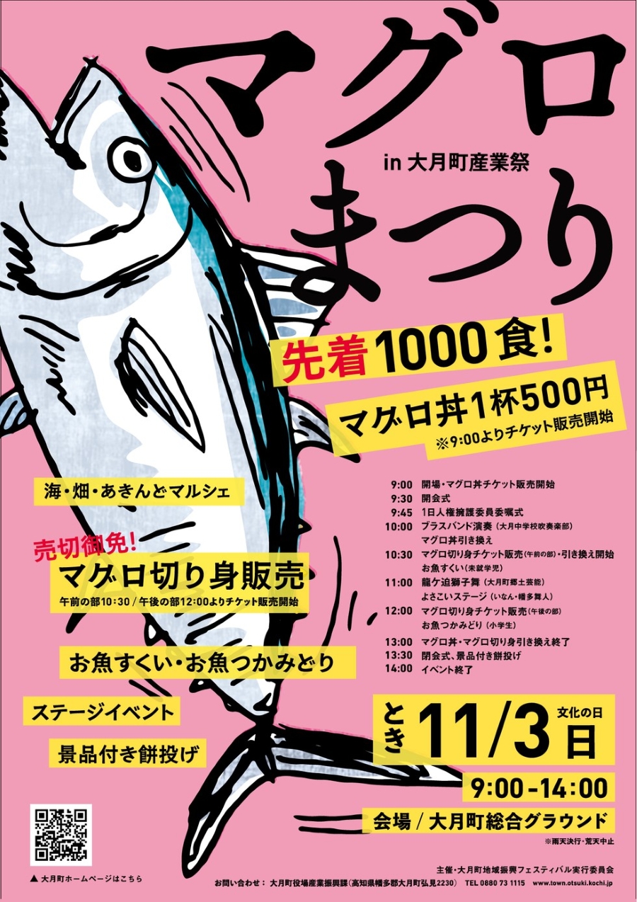大月町弘見の大月町総合グラウンドで 2025 年 11 月 3 日(月・祝)、「マグロまつり in 大月町産業祭」が開かれます。