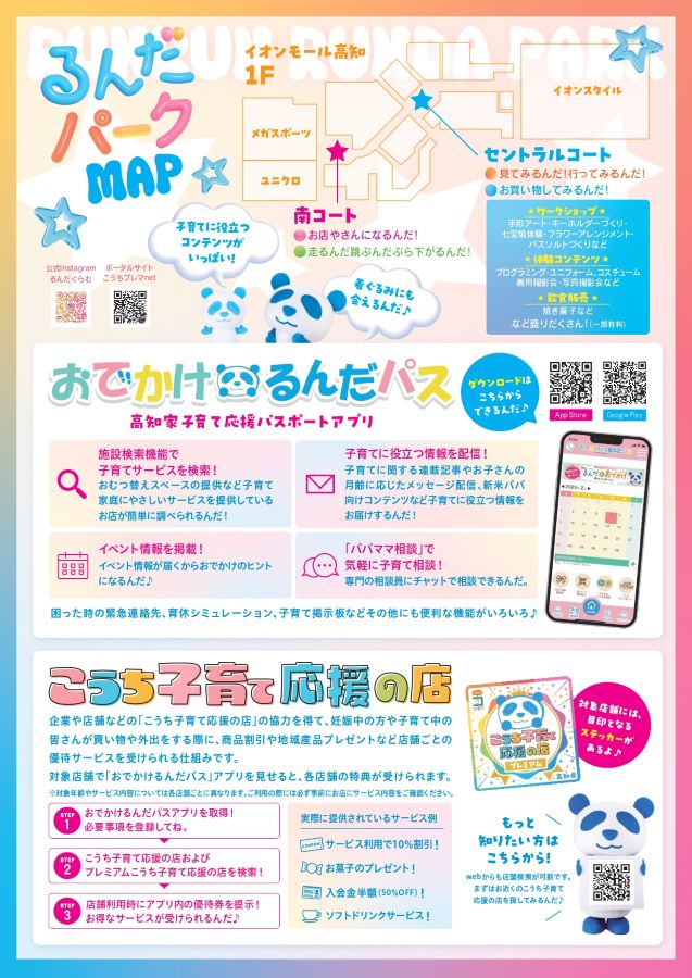 セントラルコートには「こうち子育て応援の店」が 11 ブース登場します。「おでかけるんだパス」を提示してください。
