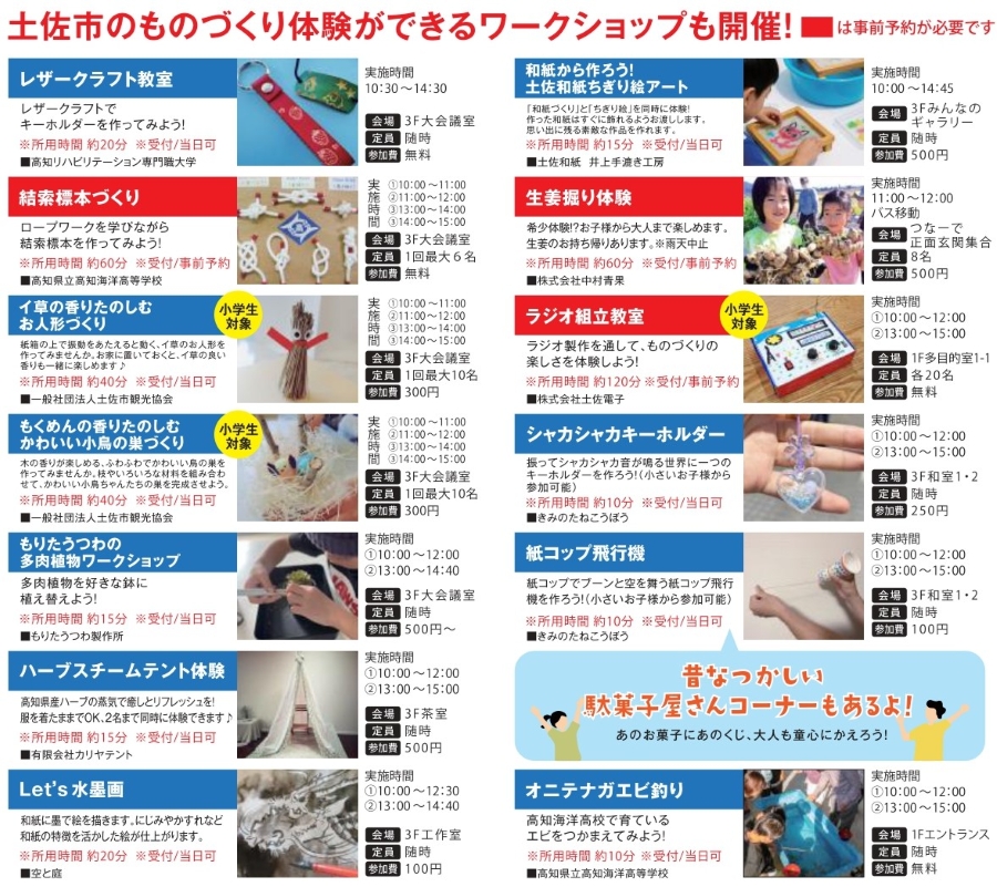 ワークショップは、レザークラフト教室、紙コップ飛行機、シャカシャカキーホルダー作り、ラジオ組み立て教室などが 10 種類以上が体験できます。事前予約が必要なものがあります。