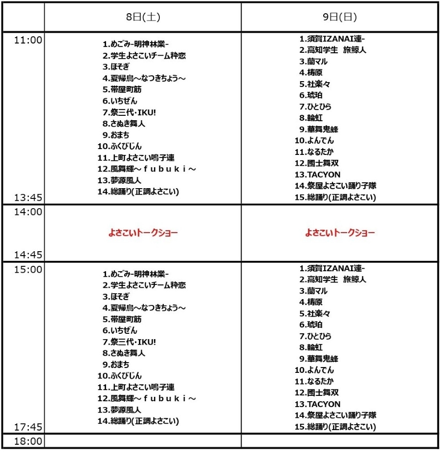 「帯屋町筋」「上町よさこい鳴子連」「國士舞双」「須賀 IZANAI 連」「TACYON」「祭三代・IKU!」など県内外から 27 チームが参加。日替わりで 13~14 チームがステージやストリート、総踊りなどを披露します。