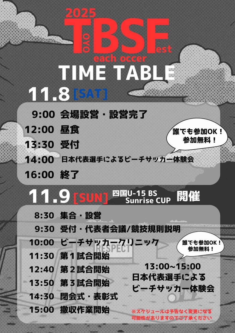 ビーチサッカーの試合は 9 日(日)11:30~ |