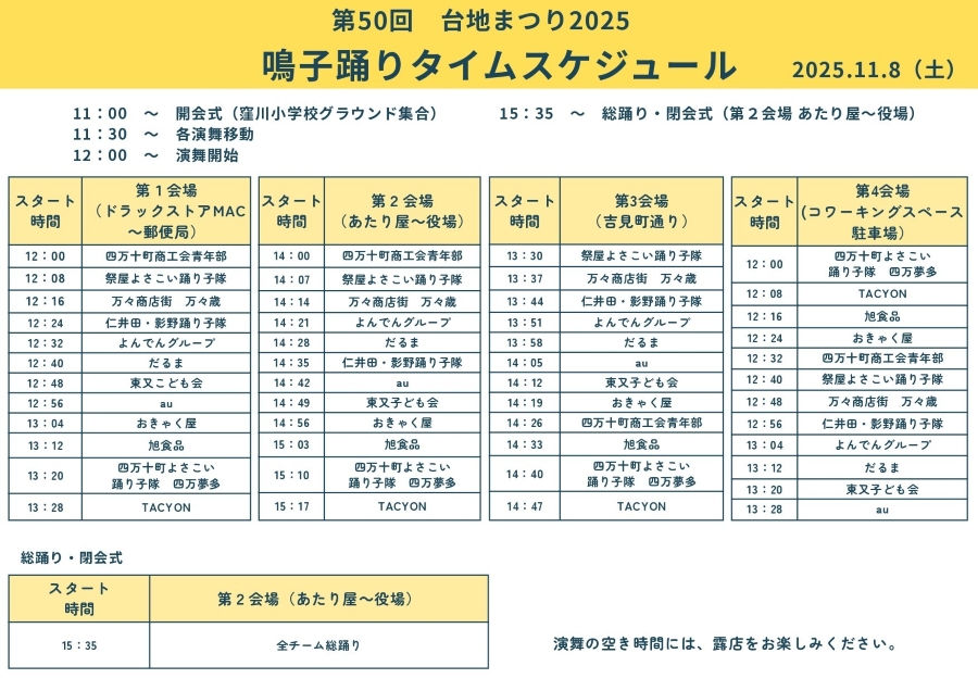 8 日(土)は窪川駅前通りやコワーキングスペースの駐車場などで、よさこい演舞が披露されます。「TACYON」「旭食品」「よんでんグループ」「四万十町よさこい踊り子隊 四万夢多」など 12 チームが登場します。