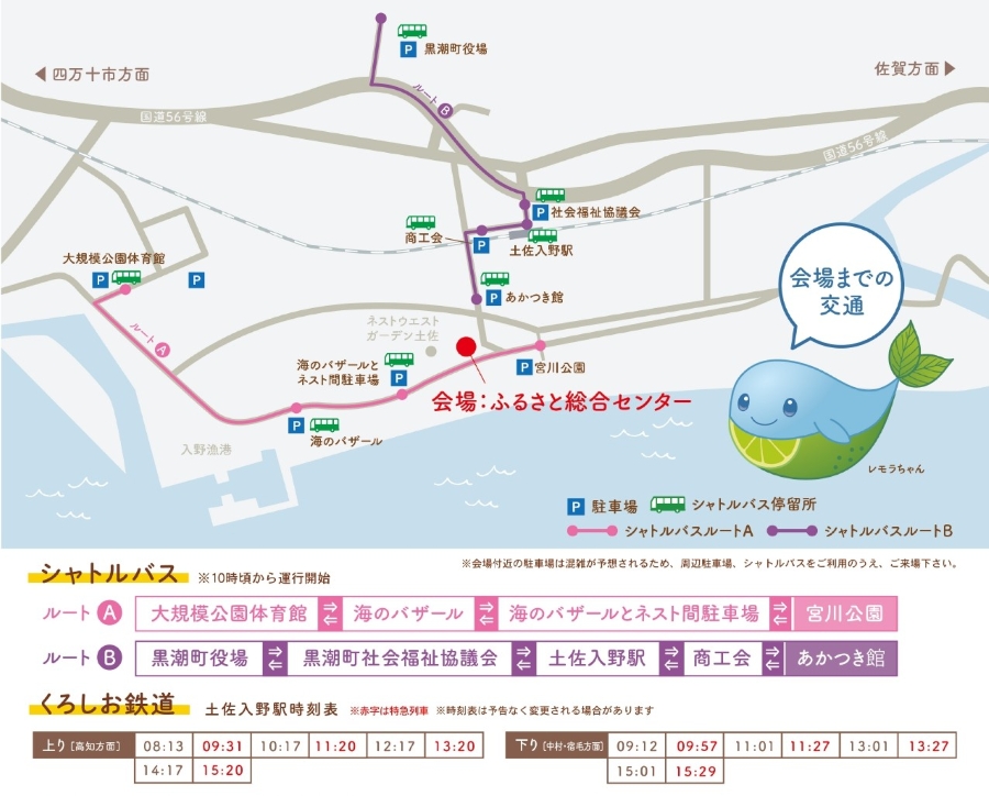 • 無料シャトルバス:10:00から運行予定。各駐車場やJR土佐入野駅と会場間を運行します。