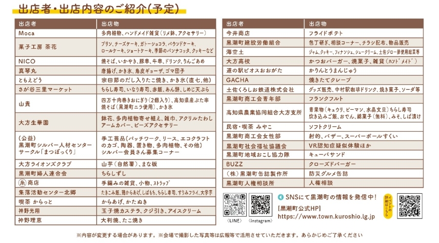 電話番号 黒潮町まるごと産業祭:0880-43-2113(黒潮町役場 産業推進室 商工観光係)