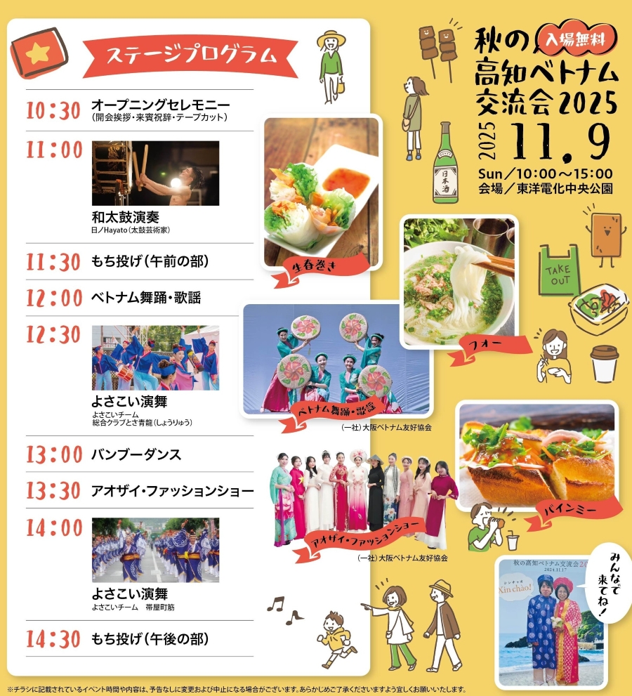 ステージではベトナム舞踊、バンブーダンス、よさこい鳴子踊り、餅投げなどが予定されています。