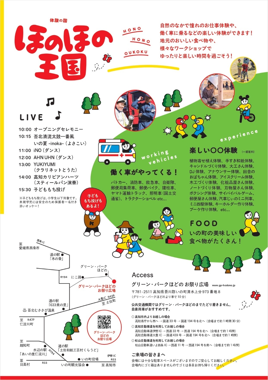 【2025年】いの町で「体験の国 ほのほの王国」(グリーン・パークほどの)|ものづくり、お仕事体験…20以上の体験メニューが登場!働く車も大集合!グルメも並びます