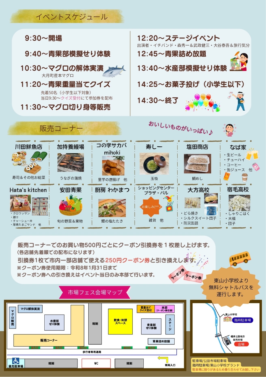 【2025年】四万十市で「市場フェス」(幡多公設地方卸売市場)|青果の詰め放題、マグロの解体ショー、競り体験、青果の重量当てクイズ、お菓子投げ…グルメも並びます