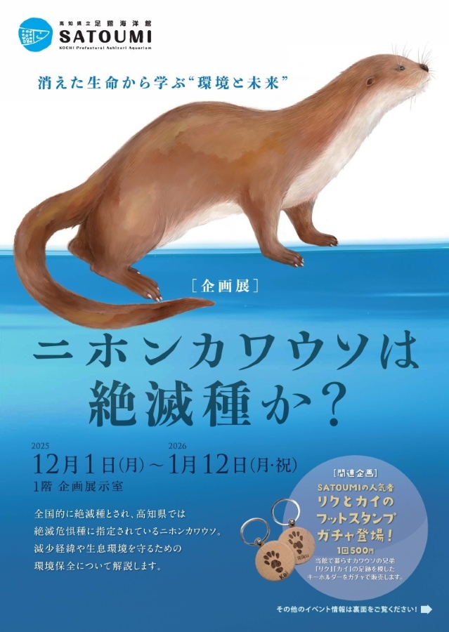 企画展「ニホンカワウソは絶滅種か?」では、減少した経緯や環境保全について解説。館内で暮らすユーラシアカワウソの兄弟「リク」と「カイ」のフットスタンプガチャが登場します。1 月 12 日(月・祝)まで。