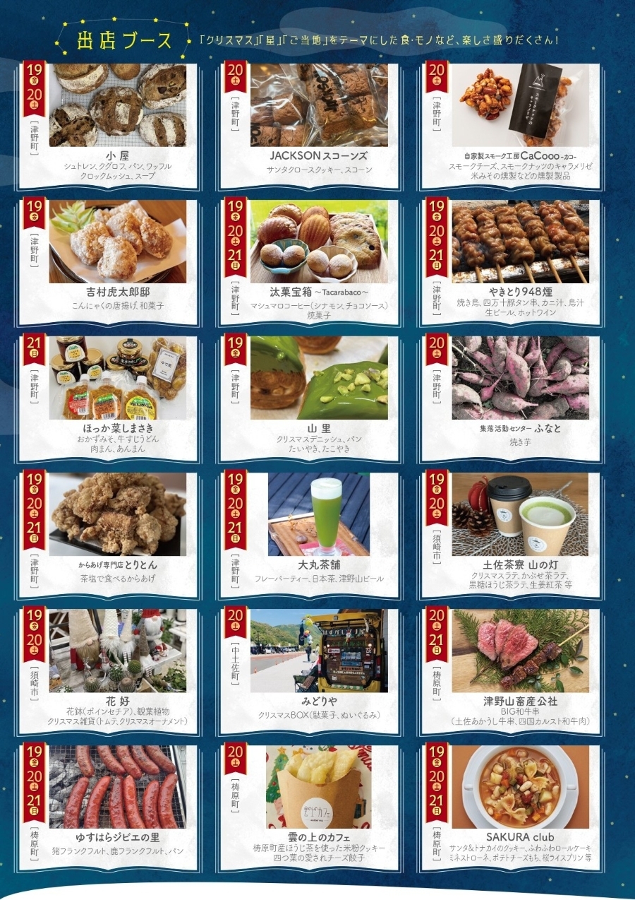 グルメは焼き鳥、茶塩で食べる唐揚げ、イノシシやシカのフランクフルト、焼き菓子、サンタ&トナカイのクッキーなど高幡地域の 18 店が参加。日替わり出店もあります。