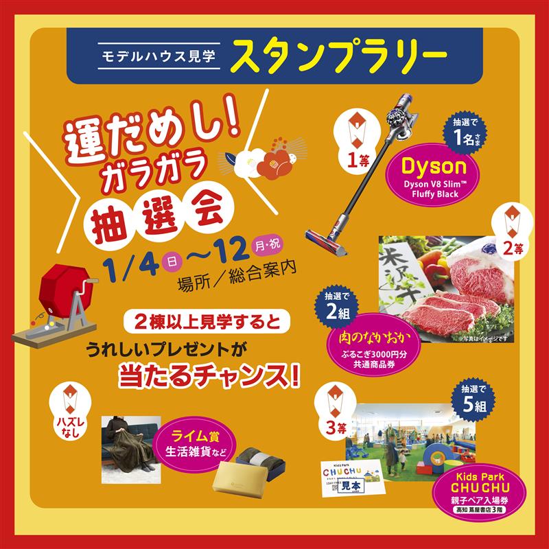期間中にモデルハウスを見学すると、空くじなしの「運試しガラガラ抽選会」に参加できます。「Dyson(ダイソン)」の掃除機やお肉券、「Kids Park CHUCHU」の親子入場券などが当たります。