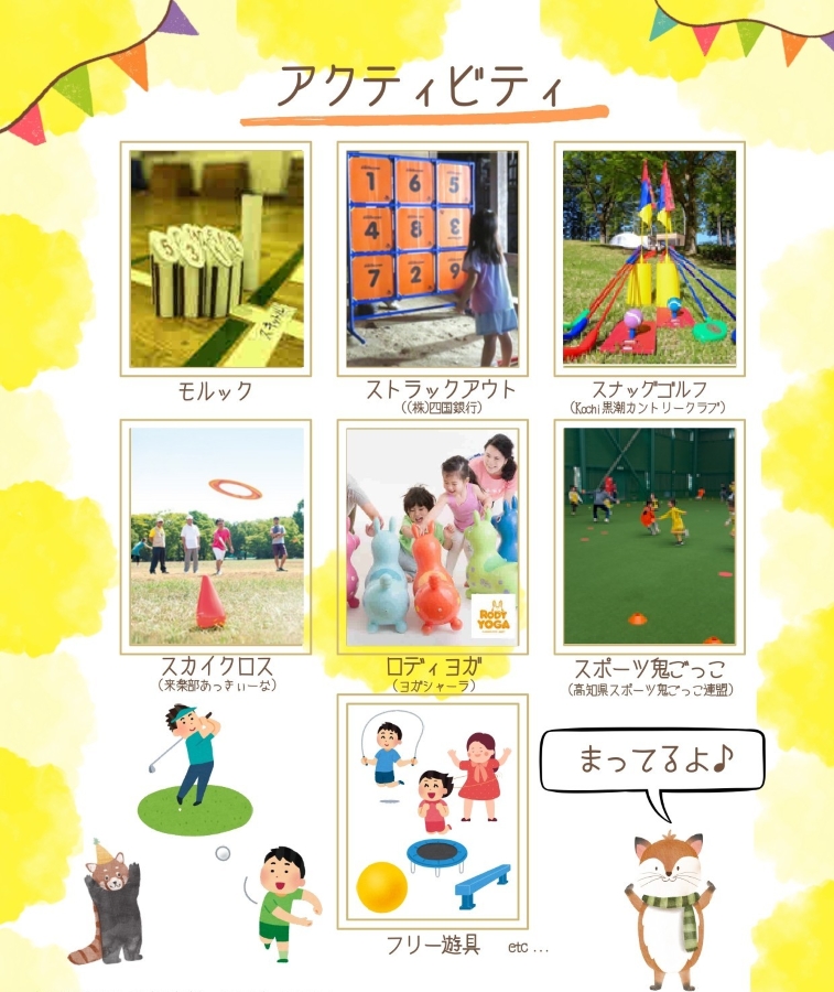 「親子うんどうひろば」ではモルック、ストラックアウト、スナッグゴルフ、スカイクロス、ロディヨガ、スポーツ鬼ごっこのブースが登場。フリー遊具もあり、自由に楽しめます。