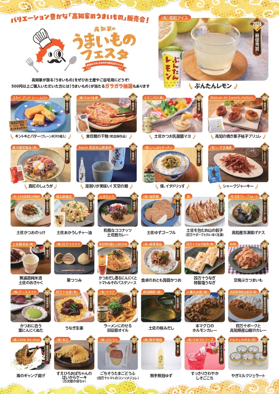 【2026年】高知市で「高知家のうまいものフェスタ」(おまち多目的広場)|「高知家のうまいもの大賞」の10周年記念イベント!2026年の受賞商品、過去10年の受賞商品が販売されます