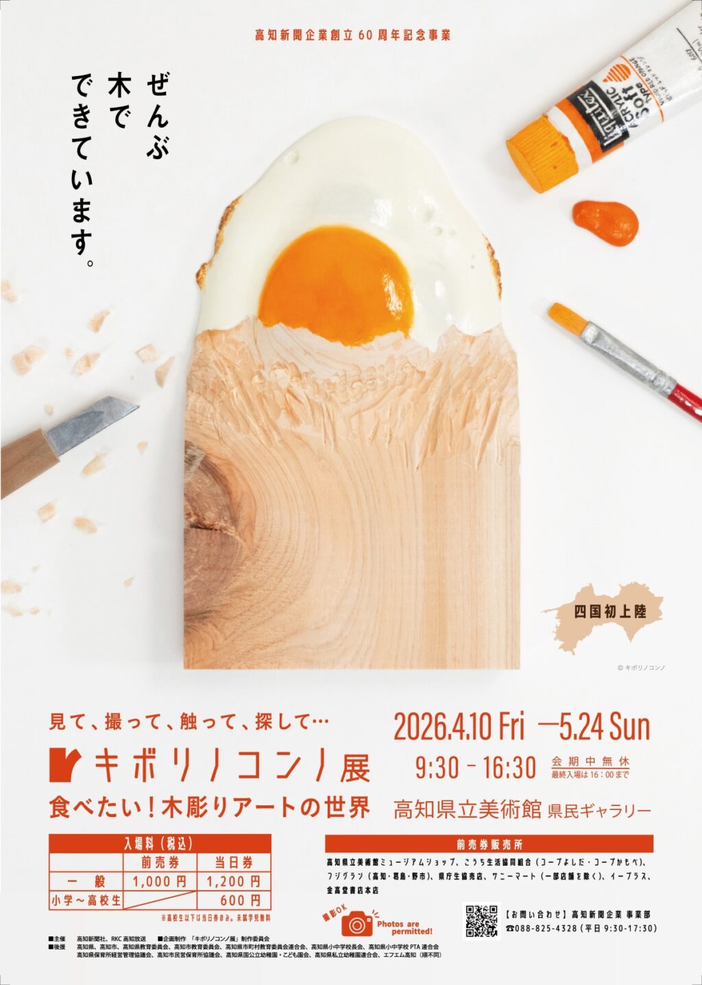 本物そっくりの木彫り作品で知られる木彫りアーティスト・キボリノコンノさんの展覧会「キボリノコンノ展 ―食べたい!木彫りアートの世界―」が 2026 年 4 月 10 日(金)~5 月 24 日(日)、高知市高須の高知県立美術館が開かれます。