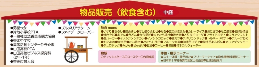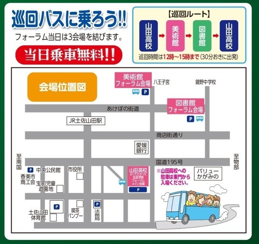 • 駐車場:山田高校グラウンド(晴天時のみ)、市役所周辺、香美市商工会、法務局、美術館、かみーるの駐車場を利用してください。