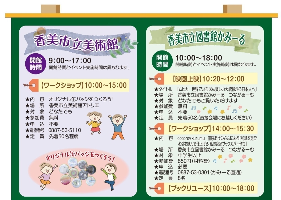 香美市立美術館では缶バッジ作りが無料で楽しめます。先着 50 人程度で予約不要です。