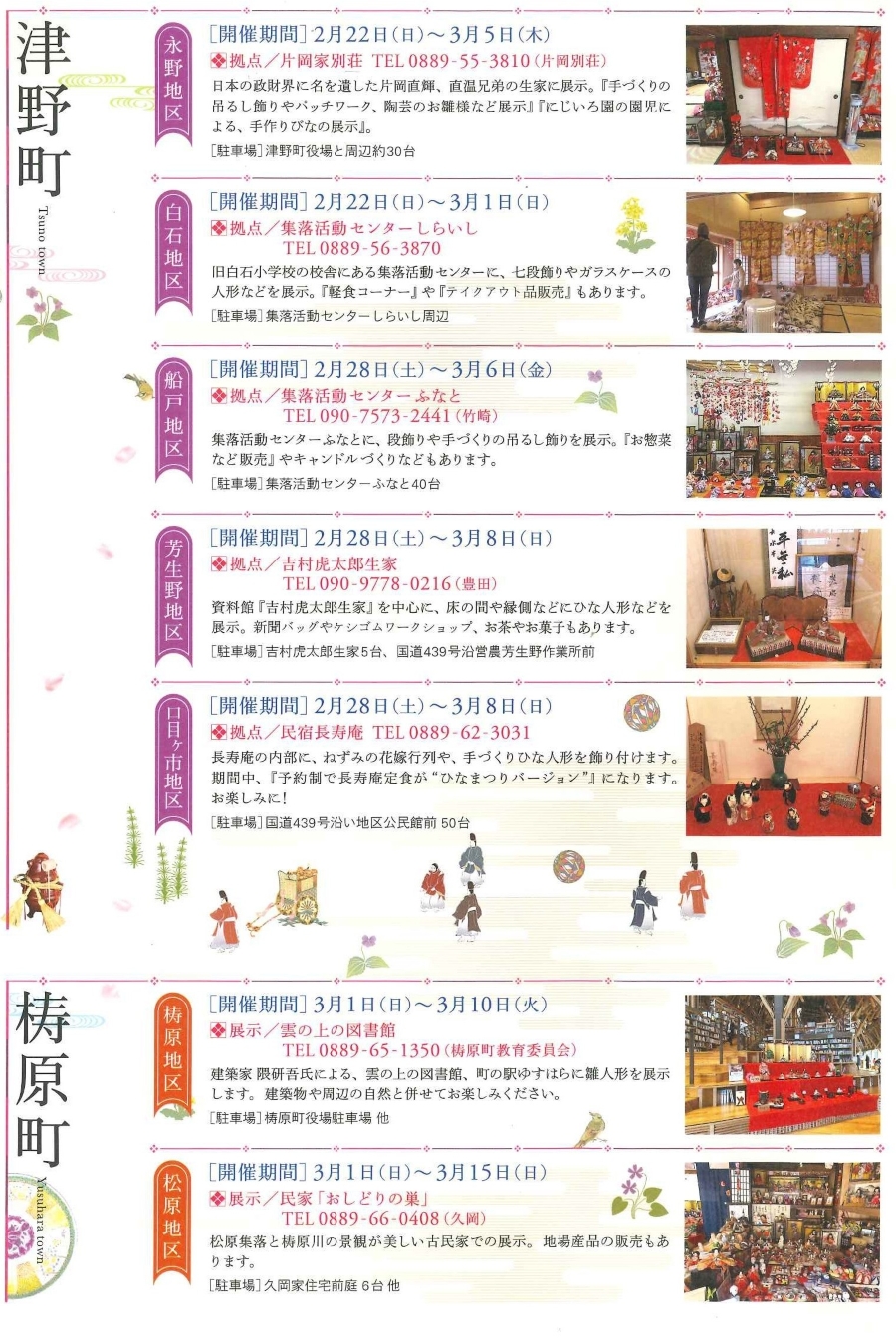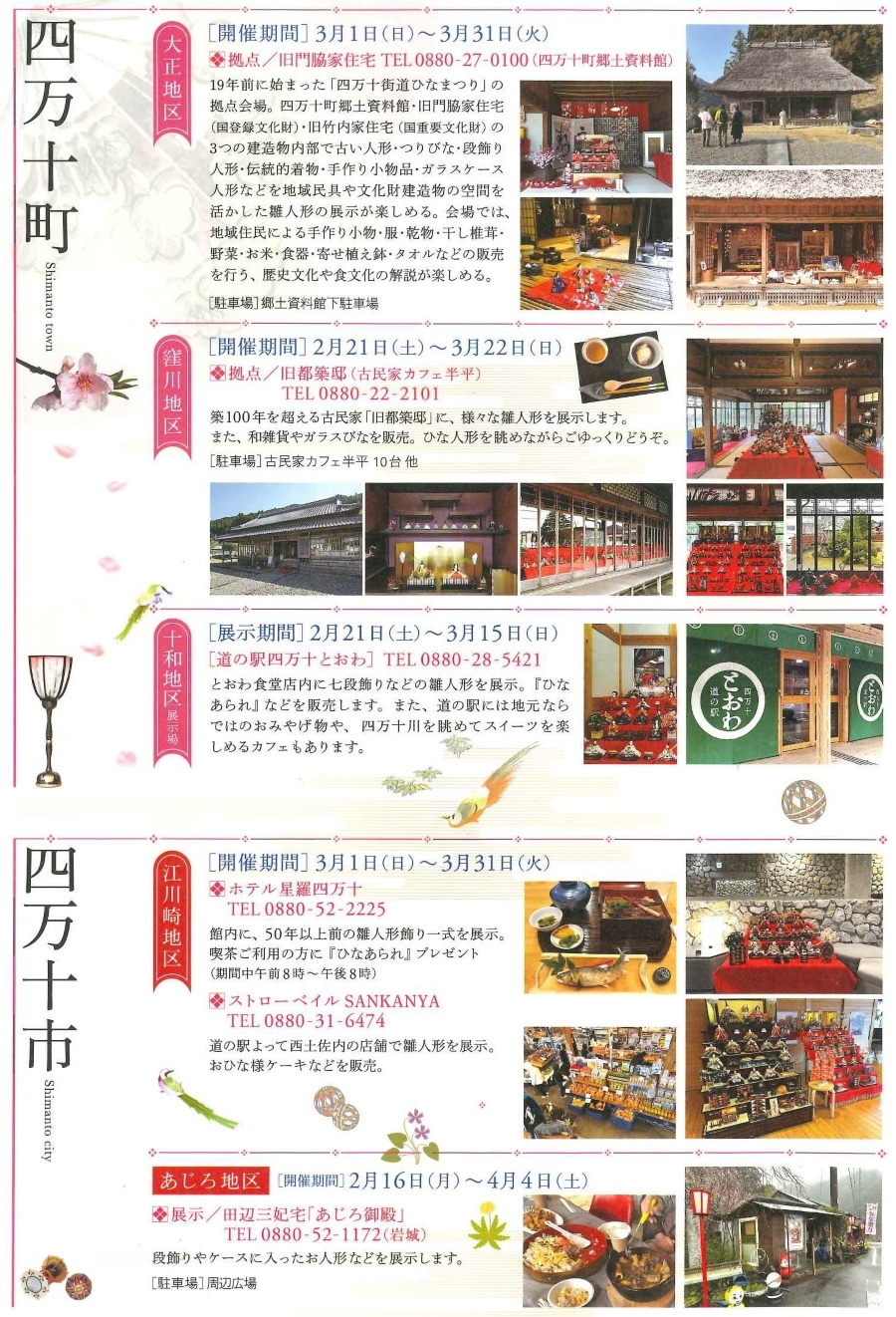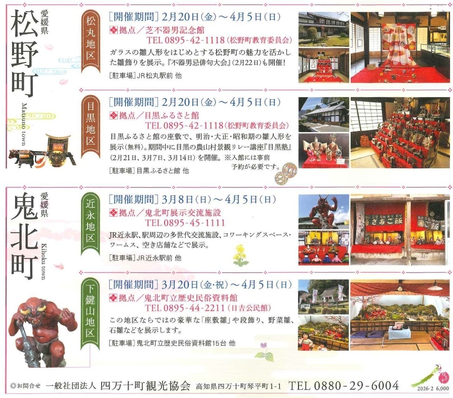 - 津野町、梼原町、中土佐町、四万十町、四万十市:2 月 14 日(土)~ 4 月 4 日(土)