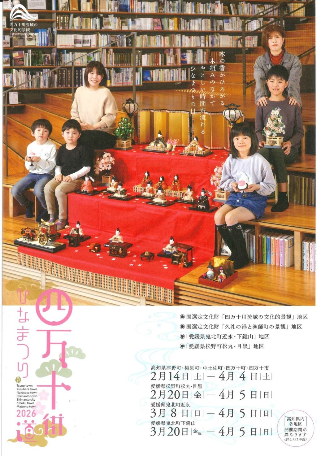 高知県内では 2026 年 2 月 14 日(土)から始まる中土佐町を皮切りに、津野町、梼原町、四万十町、四万十市で各地域のひな飾りなどが展示されます。