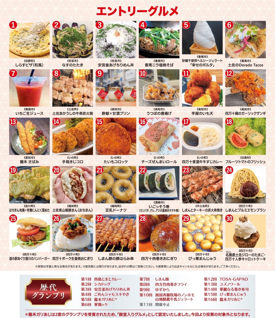 「土佐あかうしの牛串炭火焼」「芋屋のいも天」「いごっそう巻」など、県内から 30 のグルメがエントリー。人気投票でグランプリが決まります。