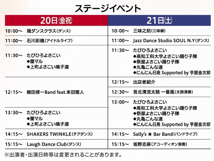 よさこい鳴子踊り、音楽ライブなどのステージイベントも楽しめます。