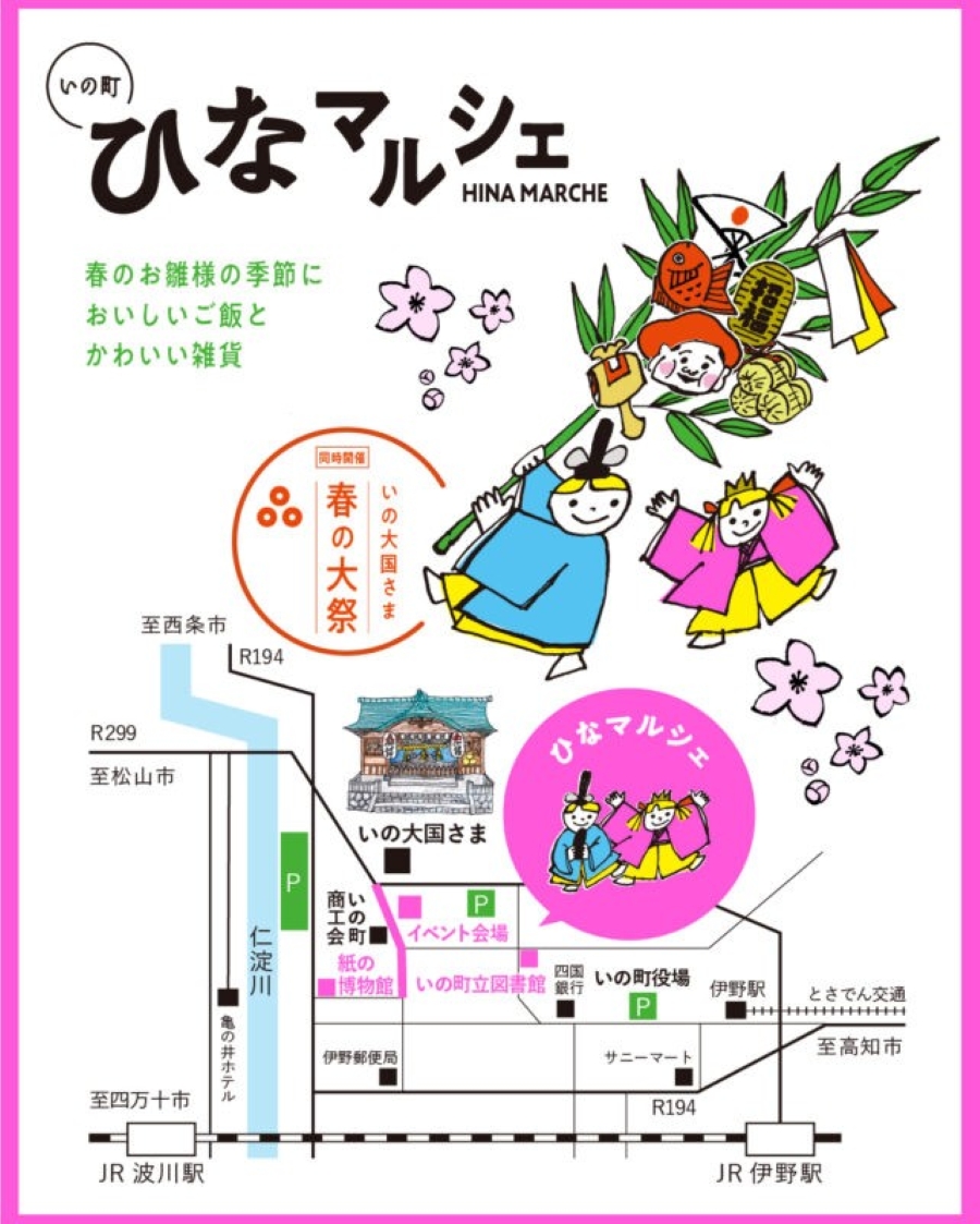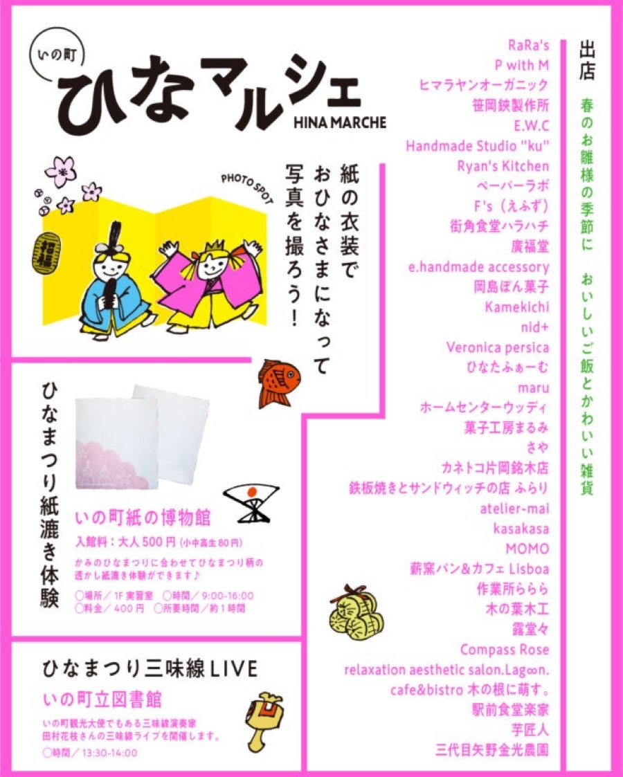 【2026年】いの町で3/8に「ひなマルシェ」(いの町商工会前など)|グルメ、雑貨、紙すき体験…紙の衣装でおひなさまに!